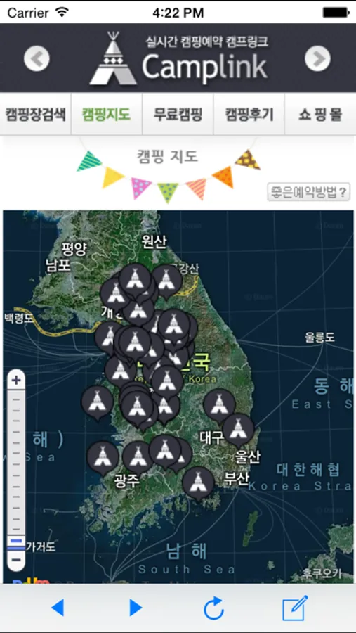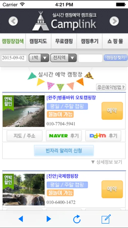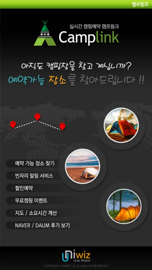 캠핑 실시간 예약 / 캠핑 후기 / 지도 / 거리,소요 시간 계산 / 빈자리 알리미 모두 한방에 끝~ 캠프링크 ~