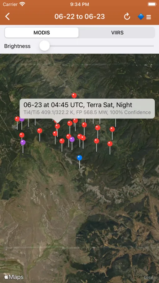 NASA MODIS and VIIRS satellite instruments: Thermal hotspot maps by region show wildfire activity in the past 48 hours. See hotspot info including fire radiance power, brightness temperature, and confidence.
