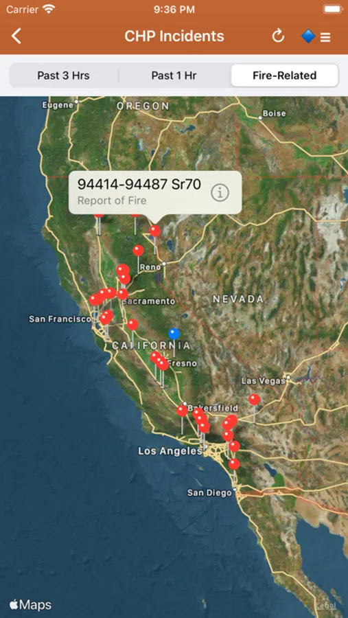 CHP (California Highway Patrol): Incidents in the past 3 hours related to fires are filtered out separately, all traffic incidents are included viewable by last 1 or 3 hours.