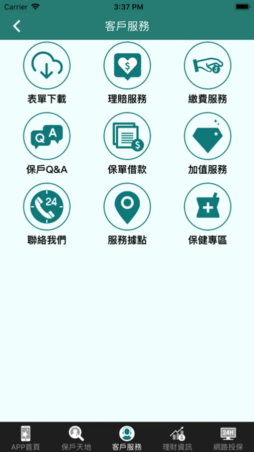 提供表單下載、理賠服務、繳費服務、保戶Q&A、保單借款、加值服務、服務據點、聯絡我們、保健專區。