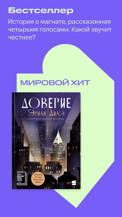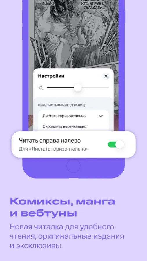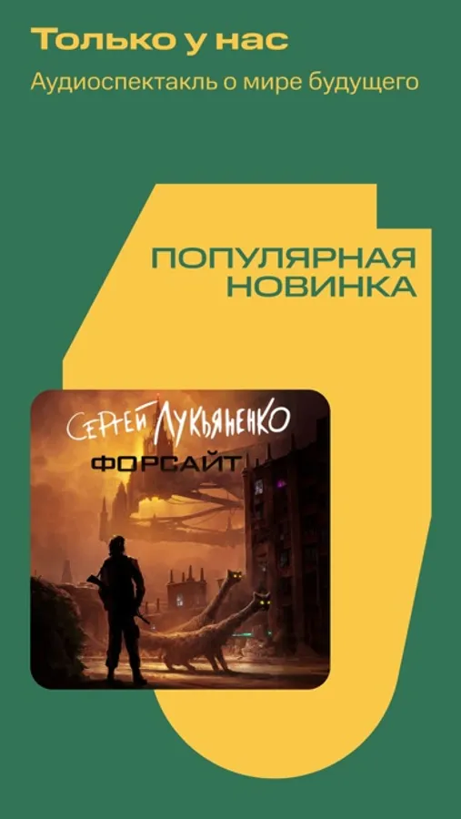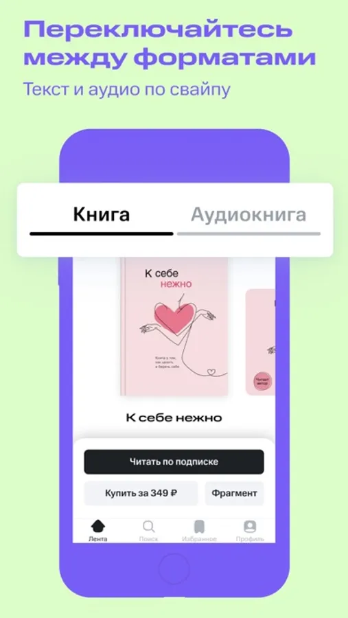 • Электронная книга и аудиокнига связаны вместе в одной карточке. Выбирайте по свайпу, что хотите сегодня — послушать или прочитать.
