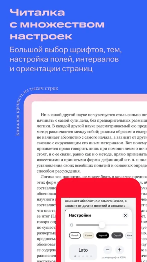 • Вы можете загрузить что-то свое в PDF и ePub-форматах и читать в «Строках». Просто настройте шрифт, стиль, подсветку и другие функции, чтобы было удобно читать.