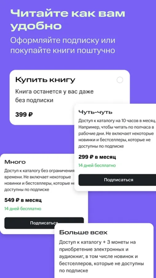 Вас ждут эксклюзивы от издательств, оригинальные произведения от популярных авторов, а также любимая классика бесплатно. Читайте и слушайте книги онлайн и без интернета. Оформляйте удобную для вас подписку или покупайте поштучно, это поможет читать в привычном темпе.
