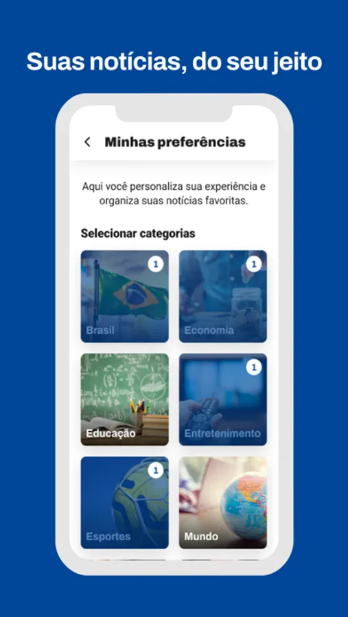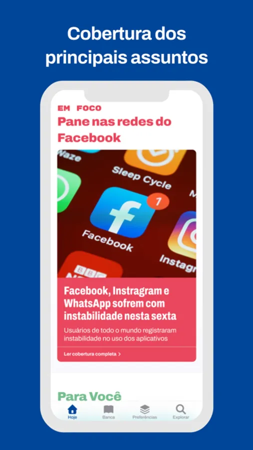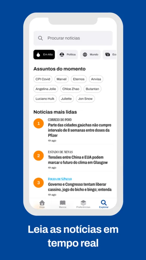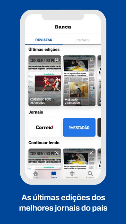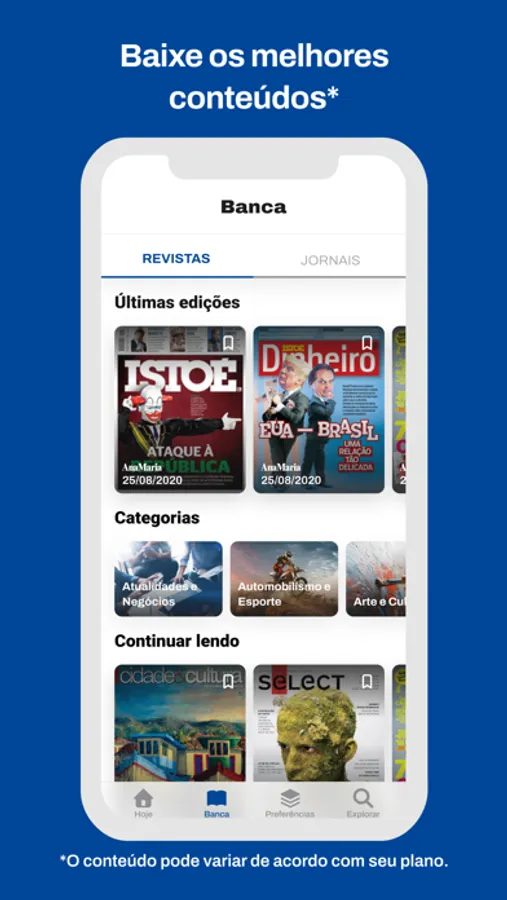 Agora você pode acompanhar seus assuntos favoritos com uma curadoria completa de jornalismo nas editorias de Política, Mundo, Economia, Brasil, Esportes, Saúde, Tecnologia, Educação e Entretenimento. São mais de 150 títulos reunidos no app para você baixar e ler quando e onde quiser.