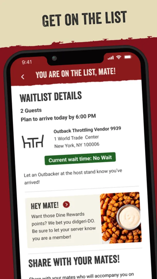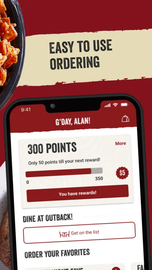 The Outback App is a convenient way to order your Outback favorites from your phone. Dine Rewards is built into the app for easy sign-up, tracking, and rewards access.