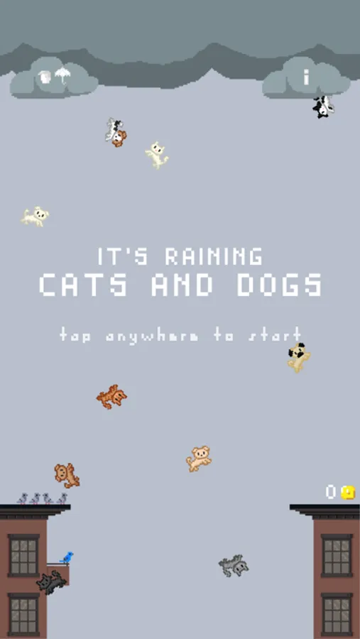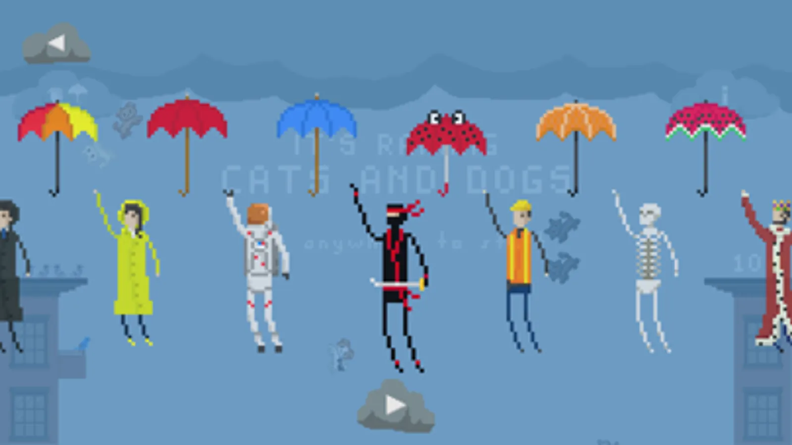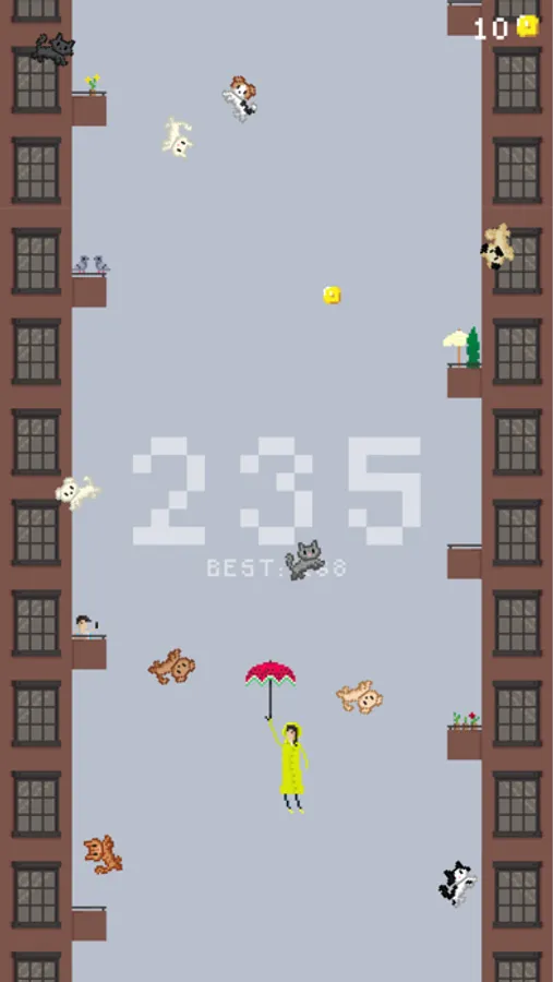 Avoid the raining cats and dogs as you fly up through the sky collecting coins. Your umbrella provides some protection, but it's not indestructible. How far can you go with your trusty umbrella?