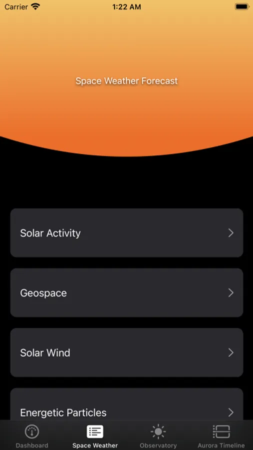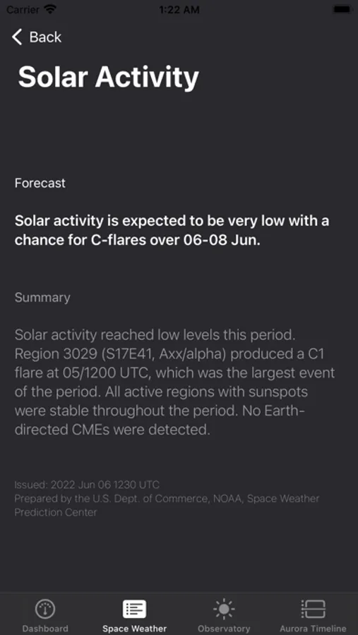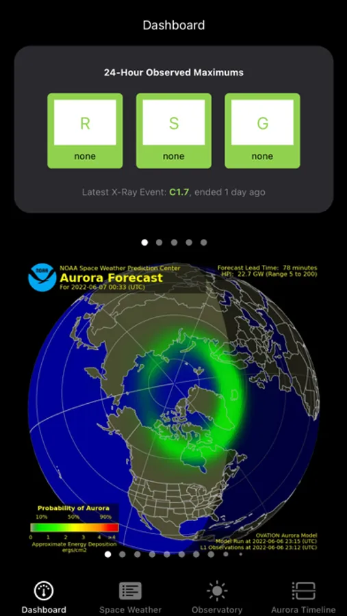 • Near-real-time ticker displaying the strength of the latest solar flare and the current solar wind speed