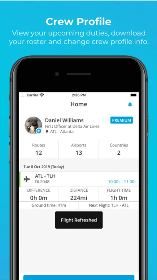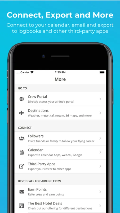 * Enjoy in-depth duty roster details, gate info, and 3D airport views and receive layover and meet-up suggestions.