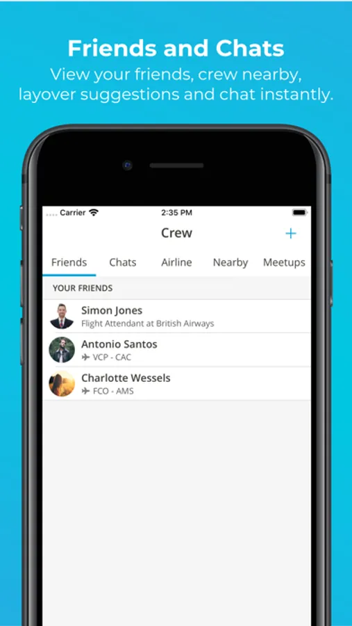 No need to exchange private phone numbers. Chat with the crew on each flight, layover or start a private conversation with your friends or anybody in our aviation community