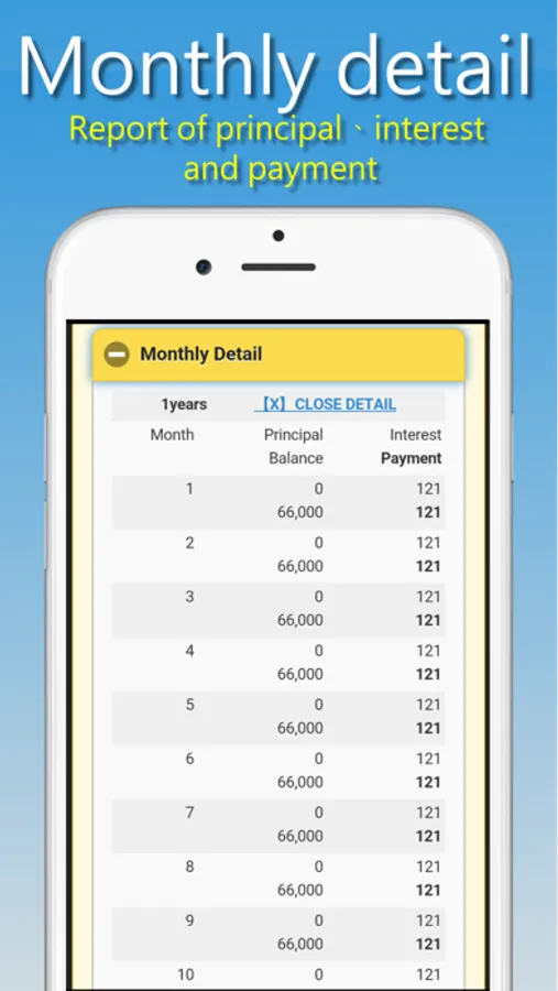 2.Monthly Payment Detail:List detailed monthly principal and interest.