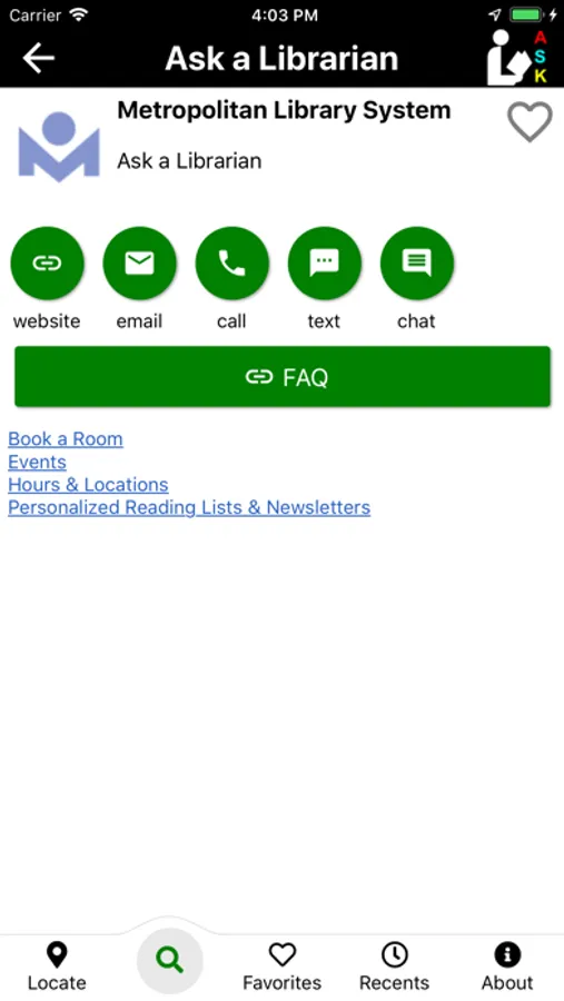 Ask A Librarian is a mobile app that connects you to all of your library's reference services, including chat, texting, email, and frequently asked questions.
