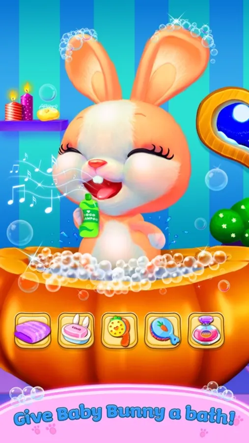 * Bathe your fluffy bunny 'till she's sparkling and clean!