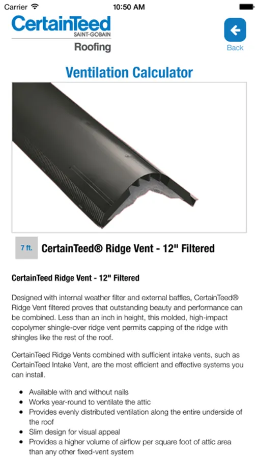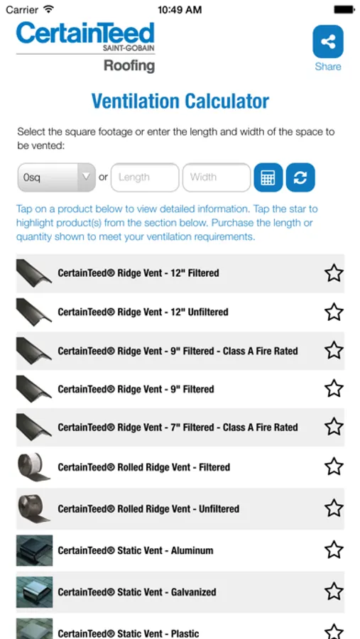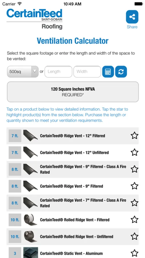 The Ventilation Calculator from CertainTeed is the ideal tool for quickly determining the amount of ventilation products needed to outfit an attic space with proper balanced ventilation. Simply enter the length and width of the attic space or the overall square footage of the space and the Ventilation Calculator produces results based upon the NFA 1/300 rule.