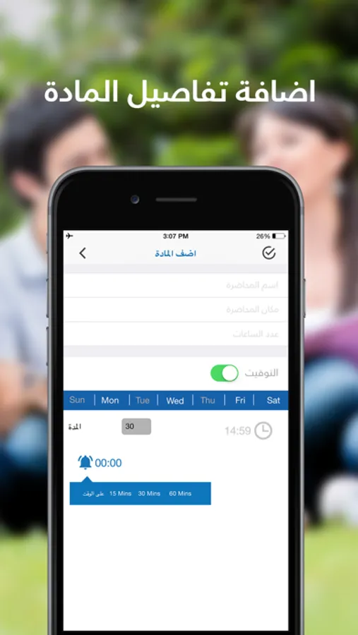 منبه المحاضرة قبل أن تبدأ ب 15 دقيقه و حتى 30 دقيقة