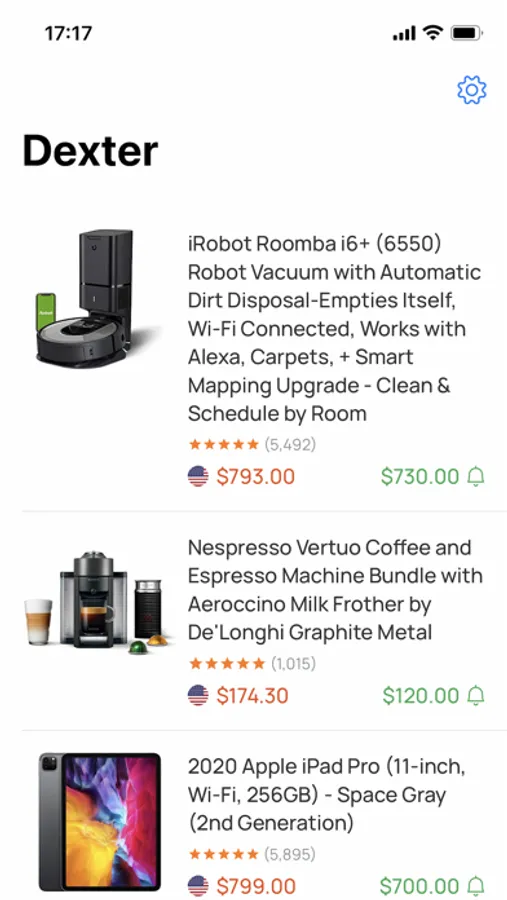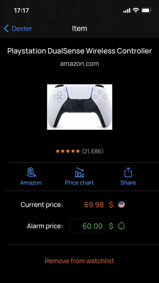 Be smart and save money with Dexter! Add Amazon items to the watchlist, set your desired price and wait. Dexter will notify you as soon as your desired price has been reached.