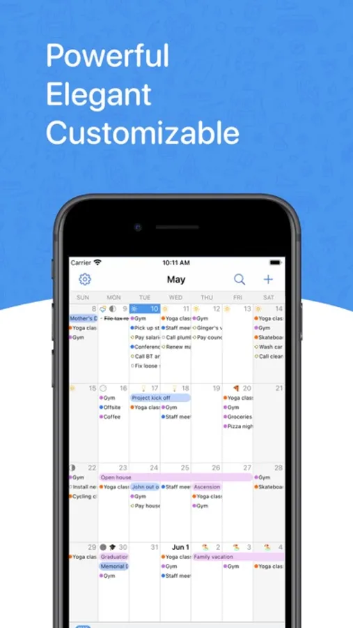 • Customize the calendar appearance including calendar colors, weather, moons, birthdays, anniversaries, event times, week numbers and more.