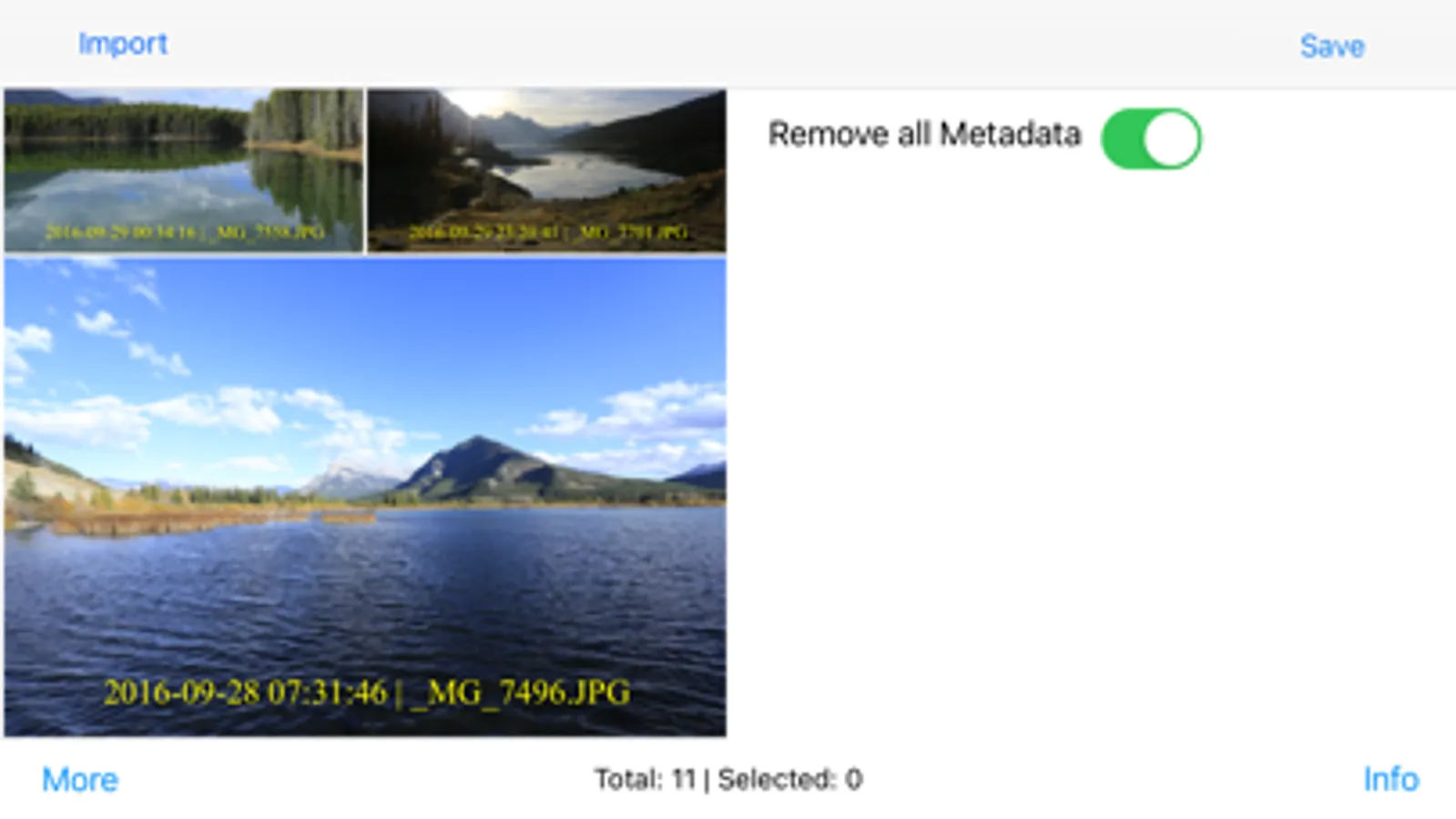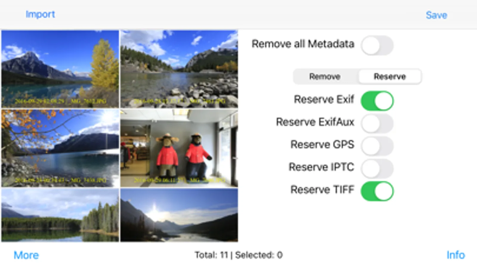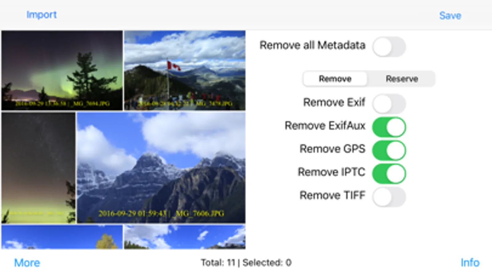 - Able to independently choose entries (Exif/ExifAux/GPS/IPTC/TIFF) from metadata to be removed