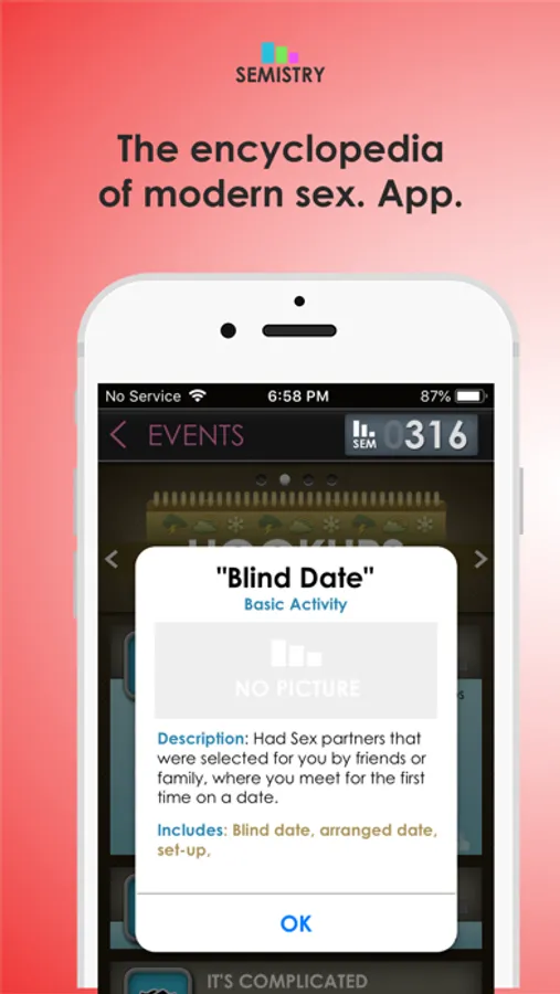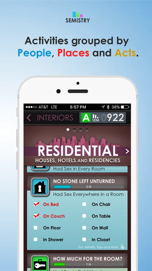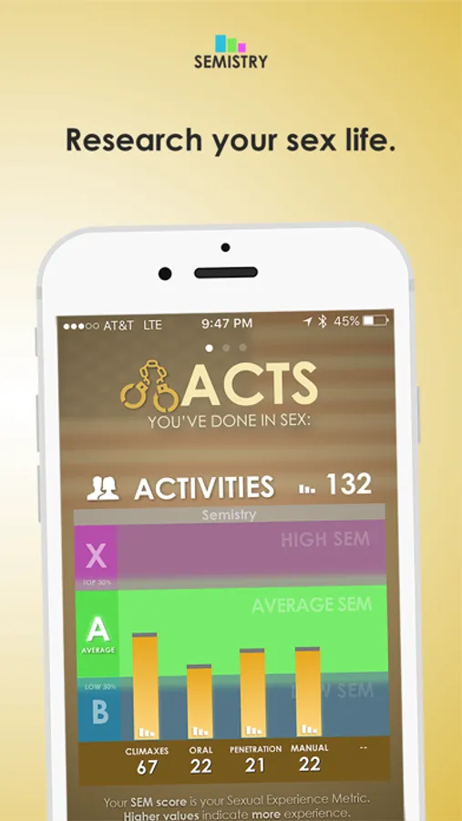 The gamified approach creates a fun and rewarding experience where users can securely and anonymously review their own sexual history. By encouraging sexual self-knowledge, Semistry seeks to break taboos, promote tolerance and diversity of sexual experience - all from the privacy of your mobile device. Research your sex life with Semistry.