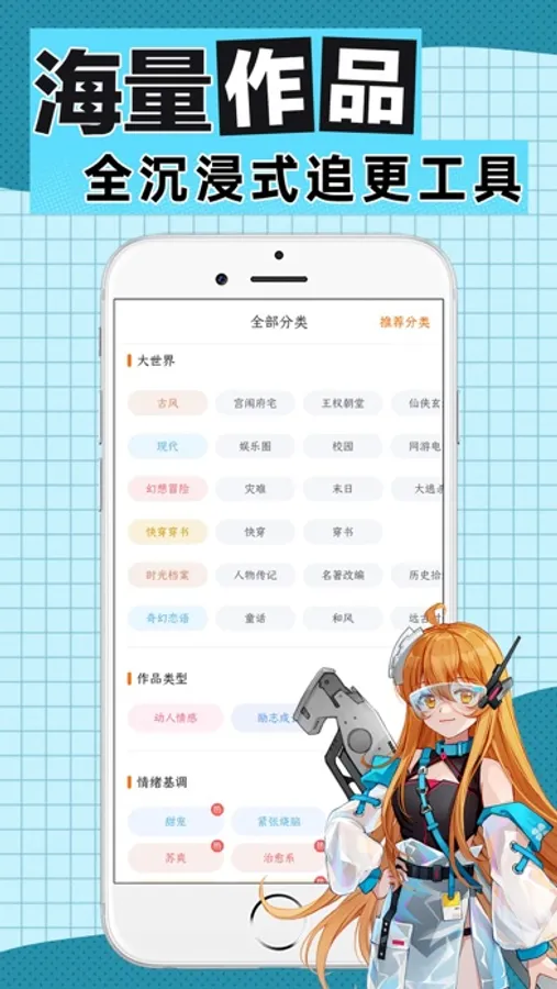 五大作品分区、上百标签分类,网罗当下所有热门题材,APP内海量原创作品让你随心追更!
