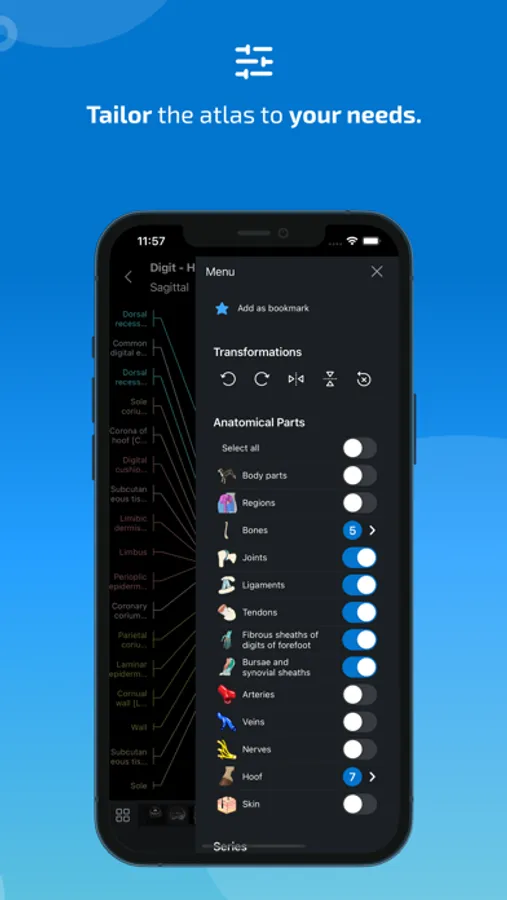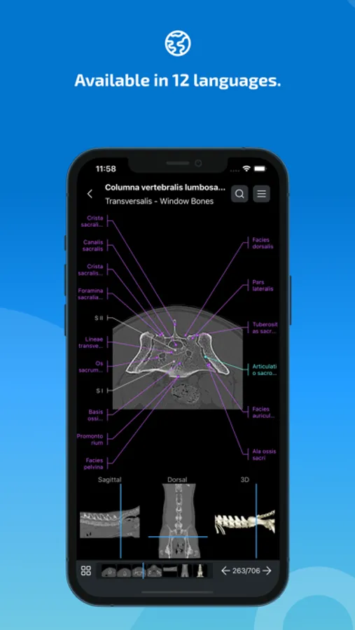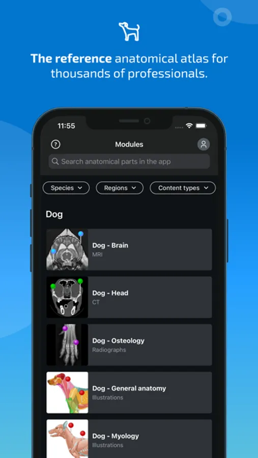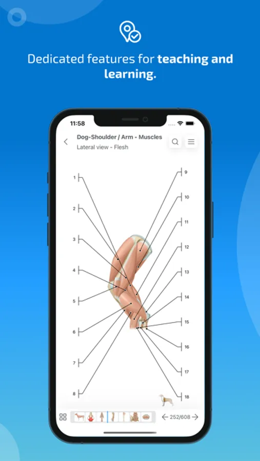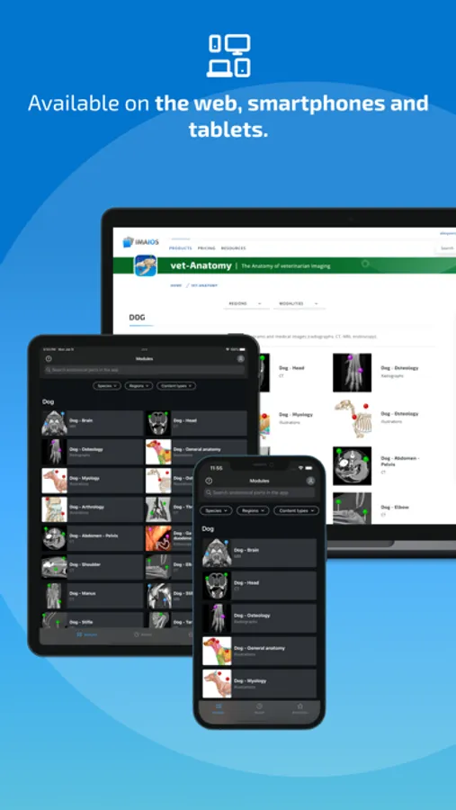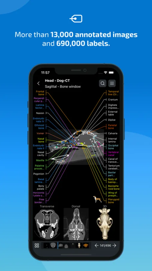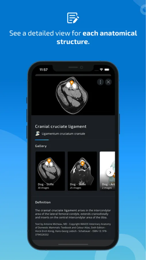 vet-Anatomy focuses in animal anatomy. It was designed in partnership with Dr. Susanne AEB Boroffka, ECVDI graduate, PhD, vet-Anatomy includes interactive and detailed radiological anatomy modules containing veterinary medical images (x-ray, CT and MRI). The images are labeled in 10 languages including the Latin Nomina Anatomica Veterinaria.