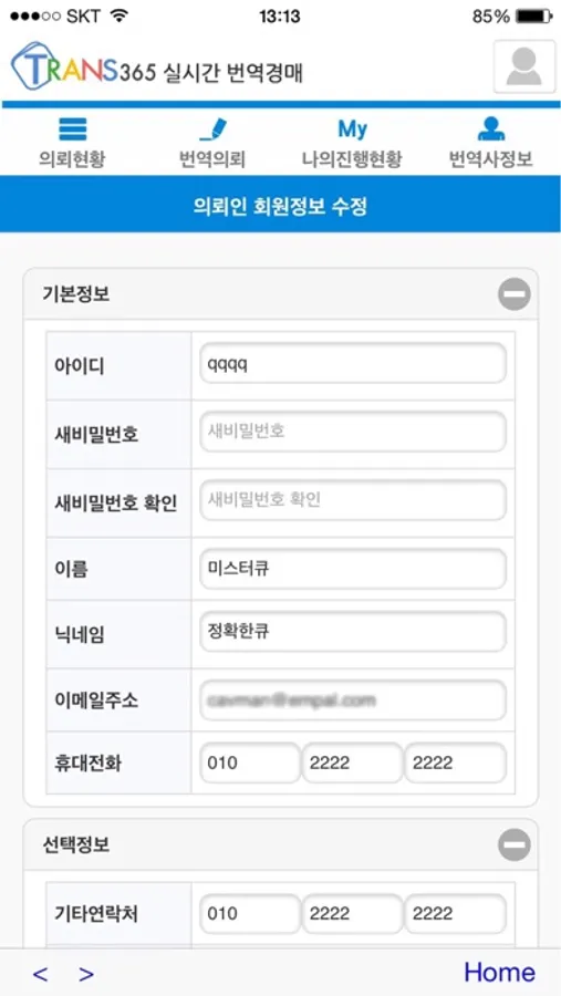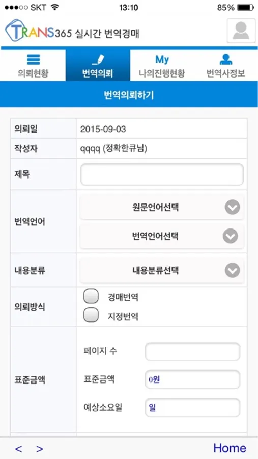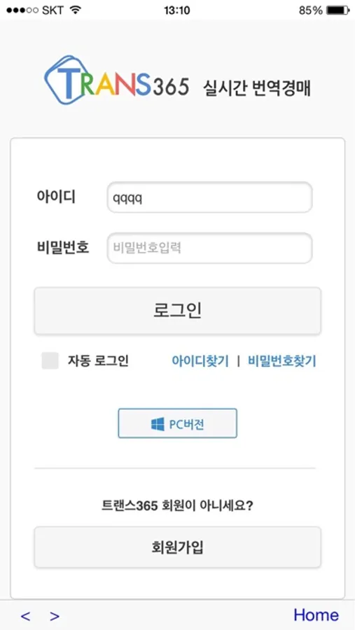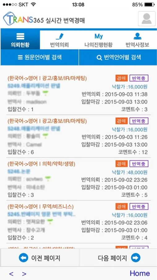 '트랜스365'는 웹 방식을 통한 번역경매 사이트 뿐 아니라 국내 최초의 스마트 폰을 이용한 번역경매 시스템을 도입하여, 번역 의뢰 사항과 경매 진행 현황 및 번역 결과 등을 고객님과 번역사 모두에게 양방향으로 실시간 정보 제공을 하여 시간과 장소의 제약 없이 요청하신 번역 건에 대한 진행 과정을 확인할 수 있습니다.