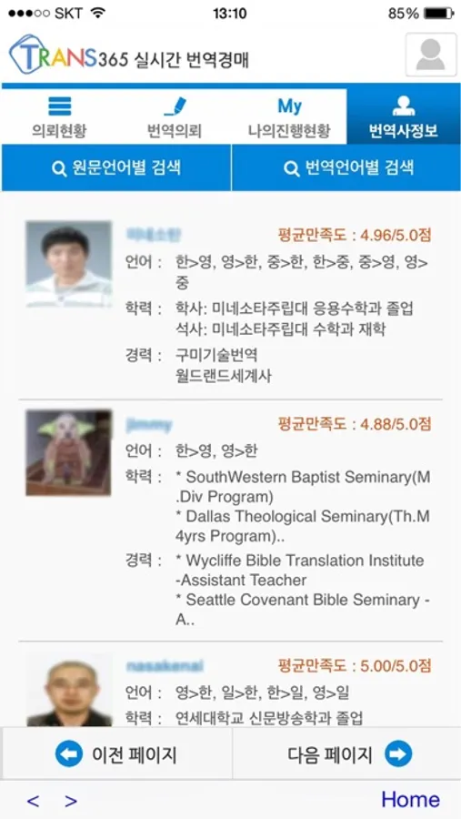 또한, 번역사는 특정 번역회사에 소속되지 않고 ‘트랜스365’에 번역사 가입을 하시는 것만으로 다양한 분야의 번역 의뢰 사항을 손쉽게 확인하여 번역에 참여할 수 있습니다.