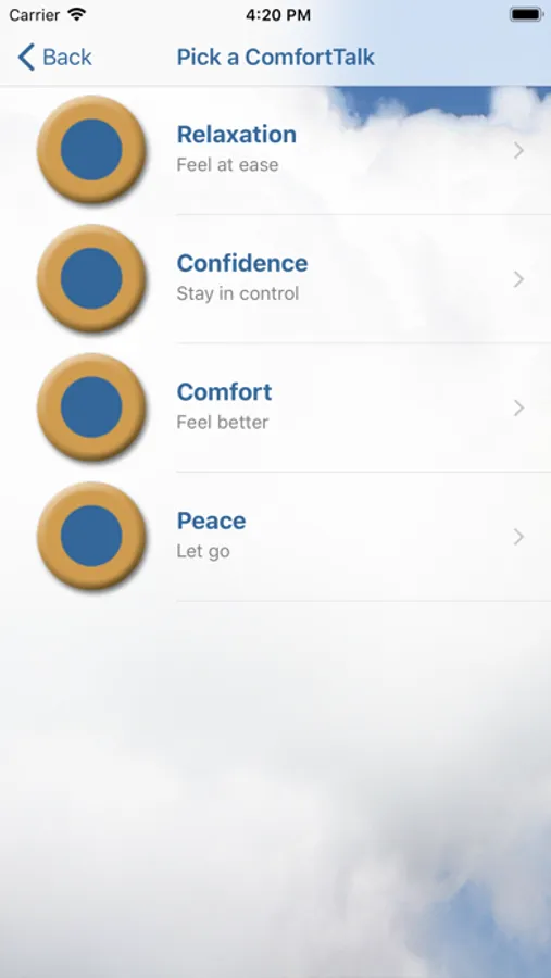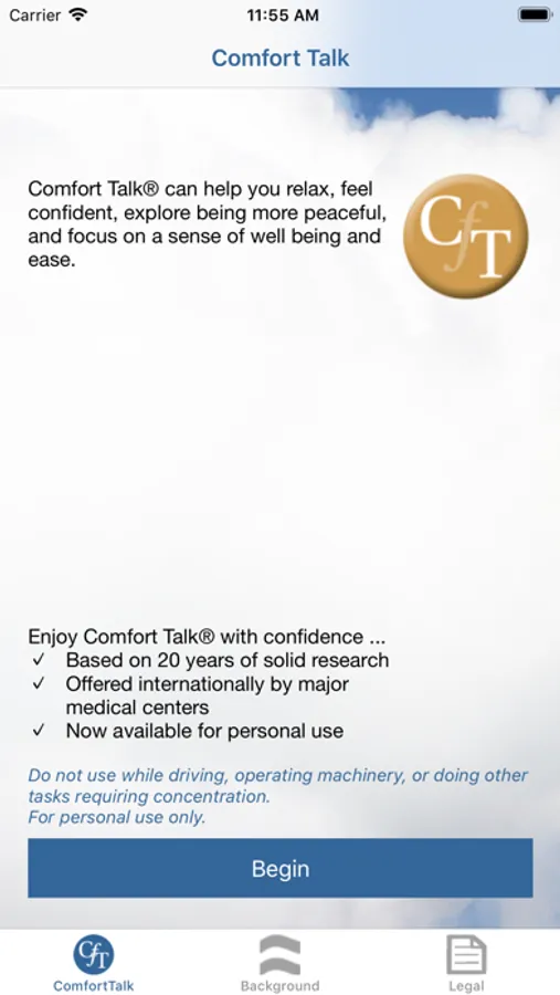 My Comfort Talk® provides customizable audio recordings to address your specific need of the moment. Just tap the Comfort button that best matches your need—•Relaxation •Confidence •Comfort • Peace—choose the length of time you have, choose the voice you prefer, and listen to be soothingly guided to quick relaxation. Use is intuitive and simple and you are always in control of your experience.