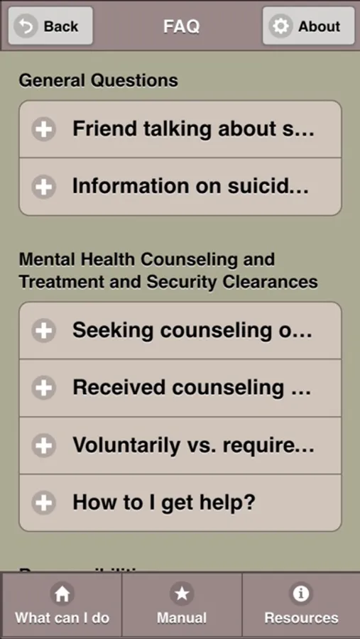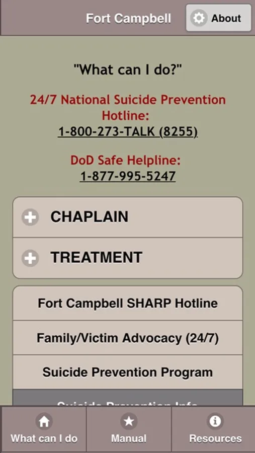 This app is to support the Suicide Prevention / Sexual Assault Campaigns and serves as an educational and resource tool to reduce high risk behaviors with the ultimate goal of eliminating sexual harassment and sexual assault amongst our ranks.