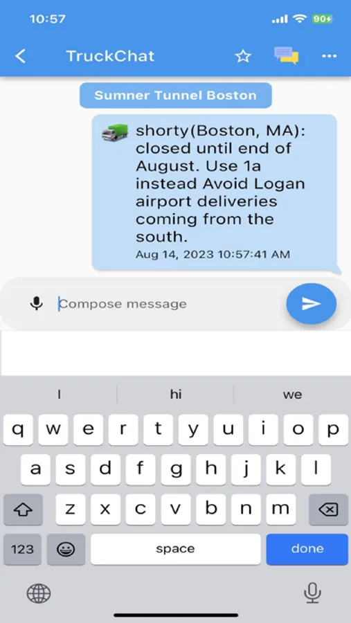 Accurate information is critical for the efficiency and safety of commercial drivers. TruckChat allows drivers to anonymously post and view messages within a predefined geographic area considering the truckers current position while travelling. Once initiated, the system allows the driver to follow the chat regardless of position if desired. The app promotes real time communications between truck drivers, allowing drivers to communicate between themselves about issues of relevance such as traffic, directions, parking availability at truck stops and rest areas, or specials of interest to drivers, based on their location. While drivers can use the phone’s built in microphone system to convert speech into text, the company is suggesting the app be used during off hours or while loading and unloading.