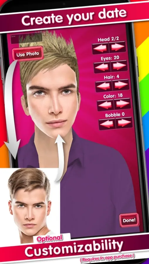 Choose from literally thousands of guys, then make your way through 35 progressive levels of game play with each level the character becomes more attached, more intimate with you. Just like a real date- you can Listen to their corny jokes and pretend to laugh! Respond to his comments through emotes, dress him up in cute outfits and costumes, tickle him, take him out to dinner, bowling, or just netflix and chill on the sofa.