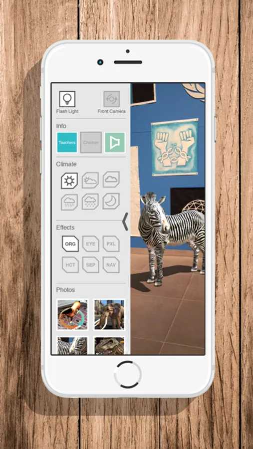 Explore all the hidden features in ZooKazam by selecting the Settings button. You can add snow or rain to your scene and even change the educational voice over from teacher to student. ZooKazam also includes over 6 different photo filters (such as black & white or fish eye) to jazz up your images. After taking a photo or video with your favorite animal, you can share them instantly to social media from within the app. The list of other special features includes: