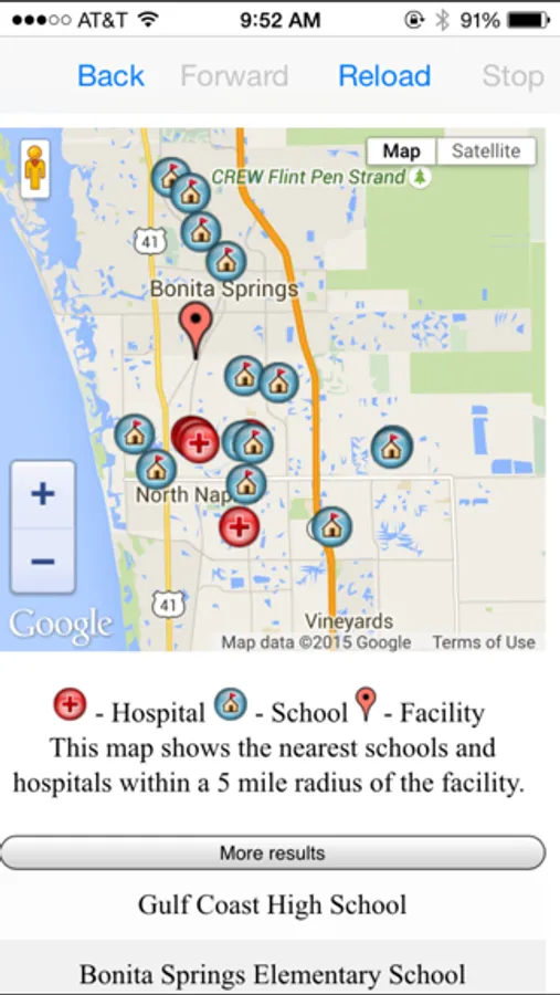 Maps of the area surrounding a fixed facility showing schools and hospitals,