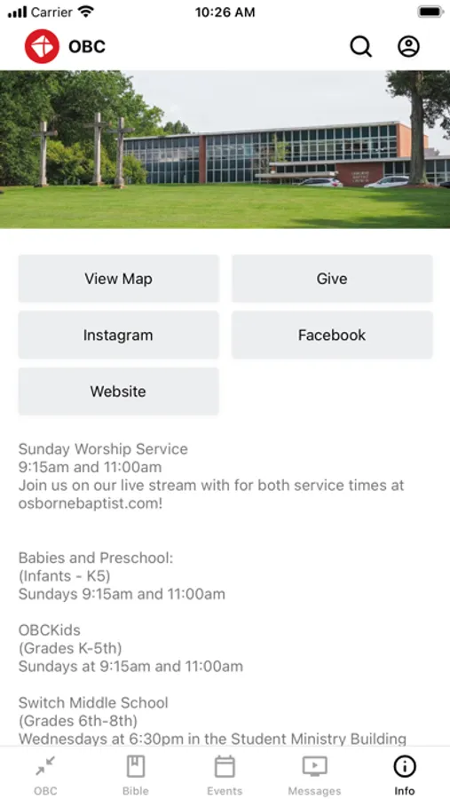 The Osborne Baptist Church App was created with the Subsplash App Platform.