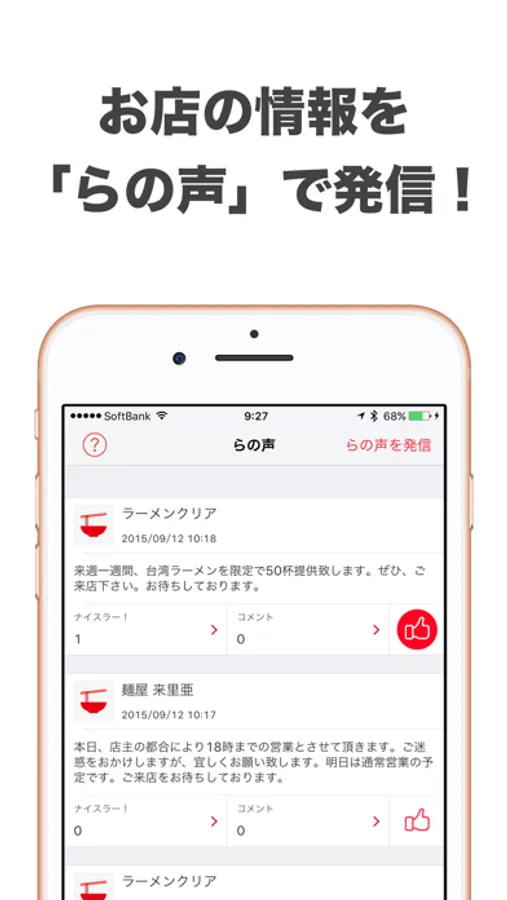 - 「毎日がラーメン」ユーザーに向けて、Twitterのように、お店の情報を「らの声」として発信