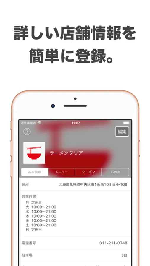 本アプリを使用すると、「毎日がラーメン」のユーザーに向けて自店の情報を発信したり、自店に関するデータをチェックすることができます。主な機能は以下の通りです。