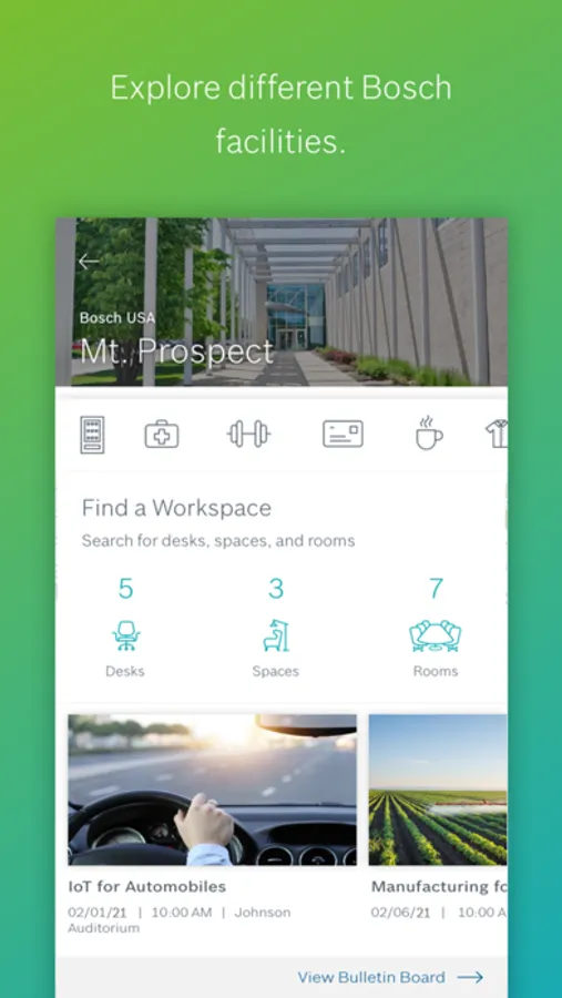 - Explore Bosch facilities: Feel confident at unfamiliar Bosch locations. Get to know on-site amenities, helpful tips and what events are happening so you can get the most out of your visit.