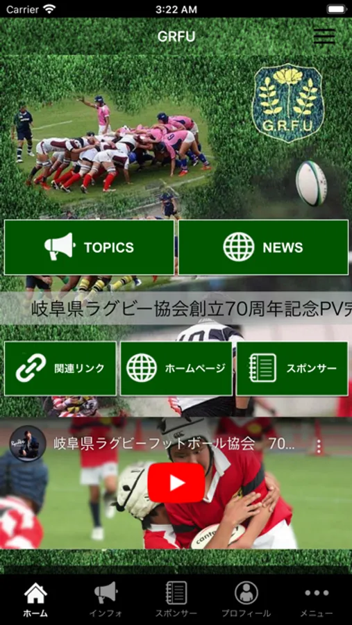 岐阜県におけるラグビーフットボール競技の健全な発達、及びその普及を図ることを目的とした岐阜県ラグビーフットボール協会『GRFU』の公式アプリです。