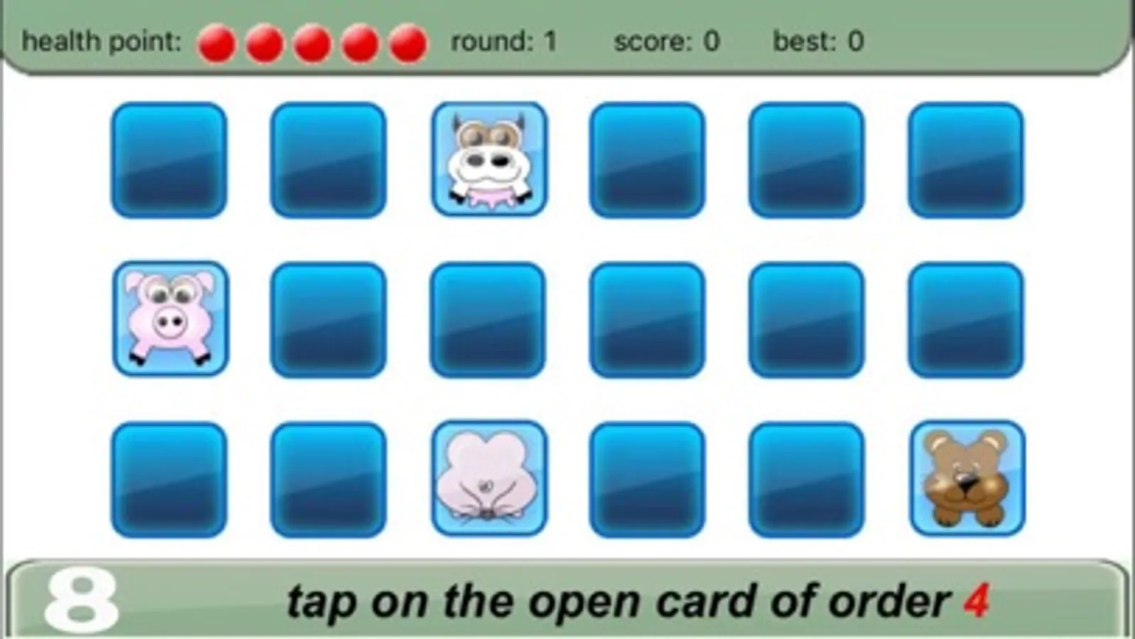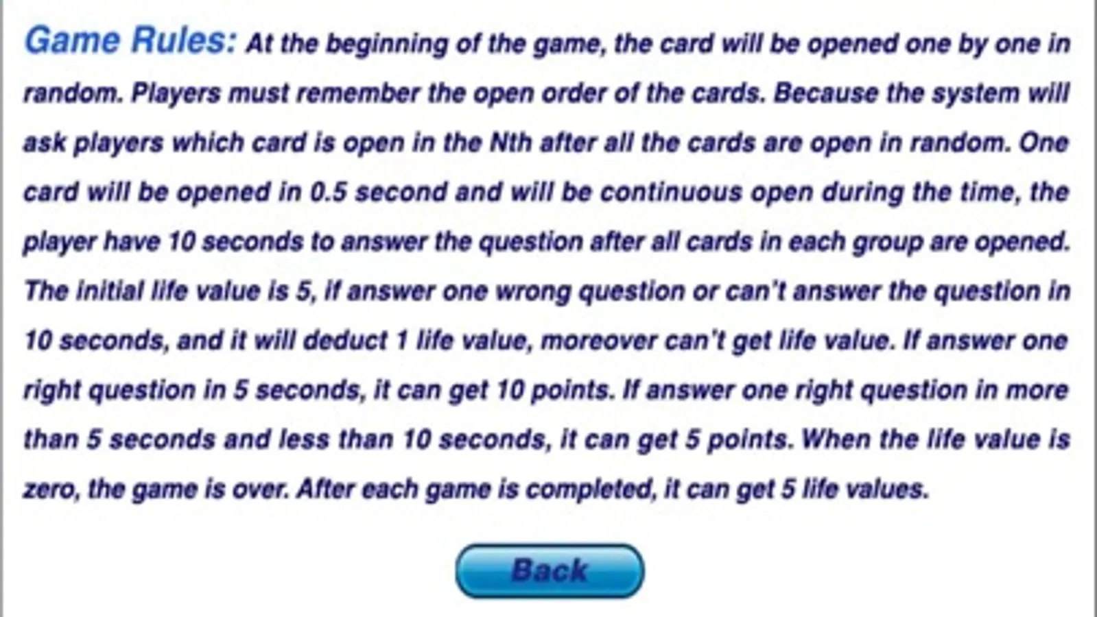 it will open the card at random order,and will ask you which card open in order N,you have at most 10 seconds to answer the question by tap on the right card.