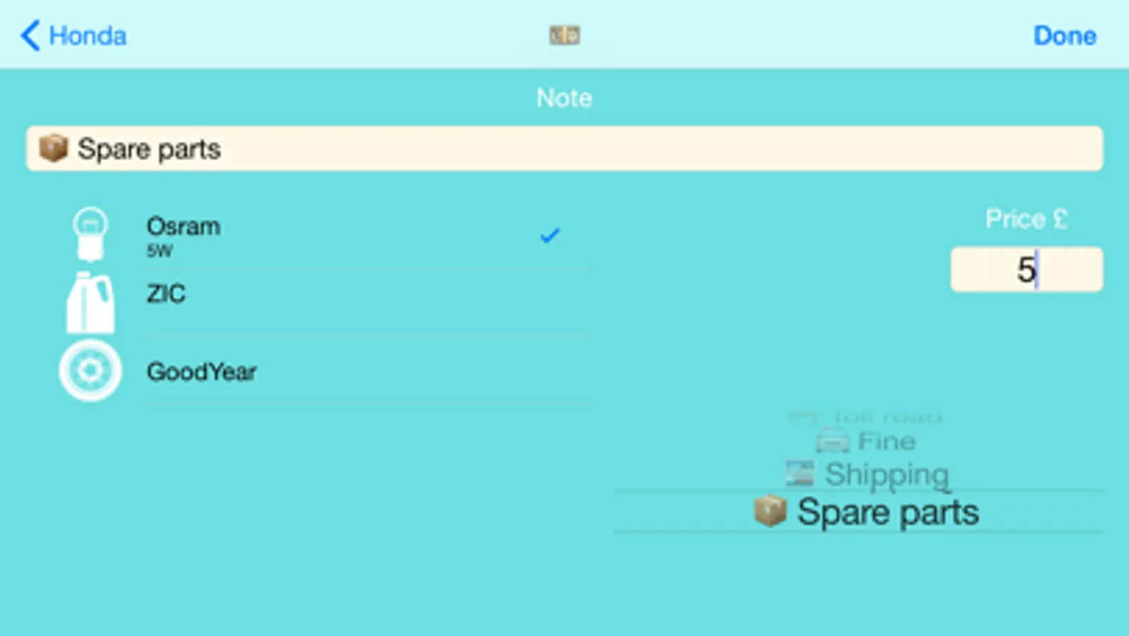 - Spares: you can create the own list of auto spares and use it for shopping. The place, time and cost of purchased spares will be marked.