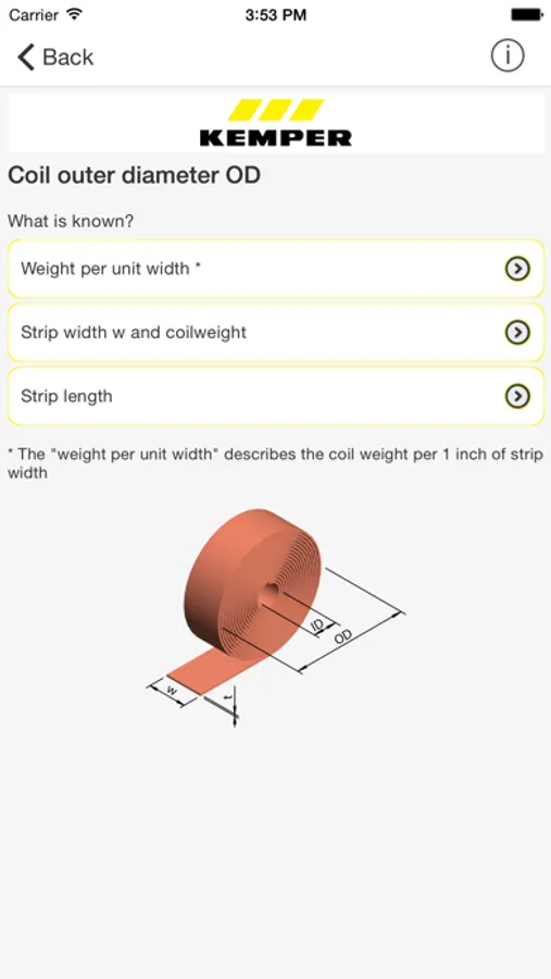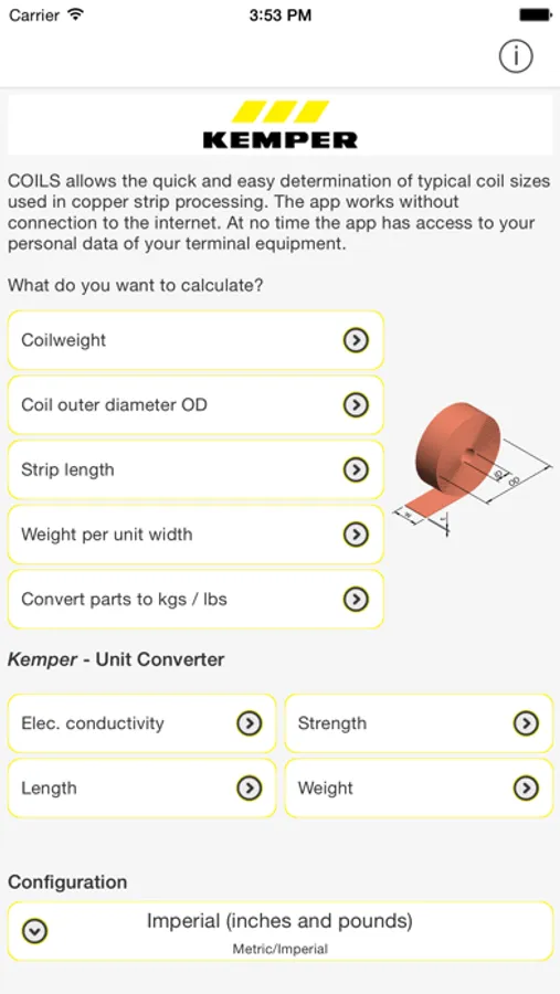 No matter if outer diameter, weight, or strip length, with COILS you comfortably determine common sizes of coiled copper and copper alloy strip. And if you want to know the quantity of metal needed for a given number of stamped parts COILS can easily show you the requested weight for the strip material. Since the app does not require an internet connection, COILS is also available offline.