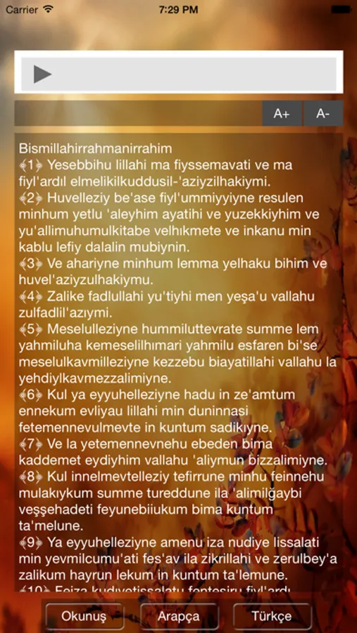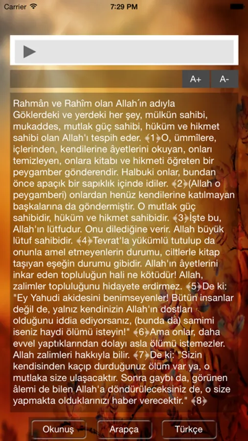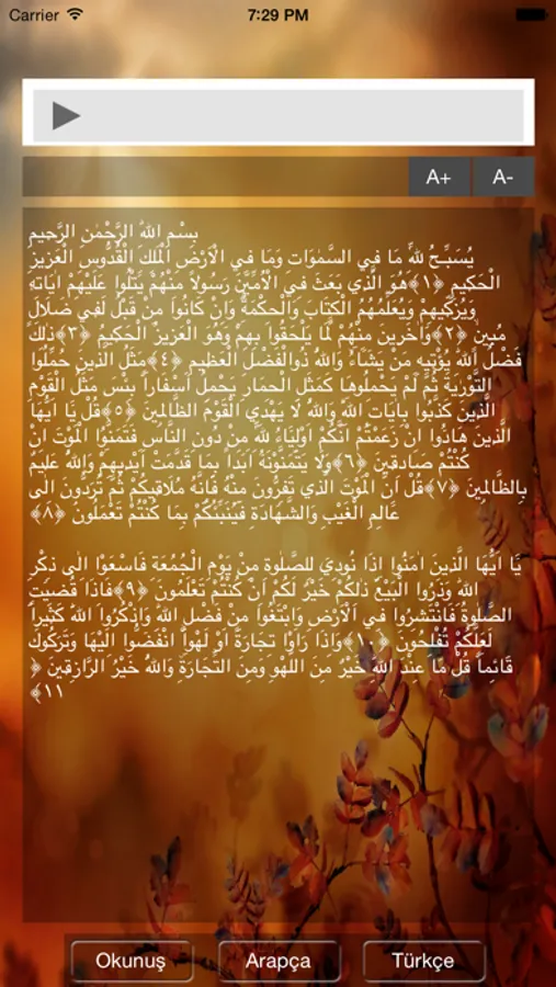 Cuma Suresi uygulamasında Türkçe okunuşunu, anlamını, Arapça yazılışını okuyabilir ve Arapçasını sesli olarak dinleyebilirsiniz.