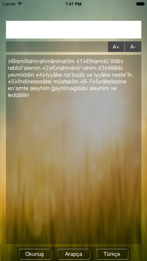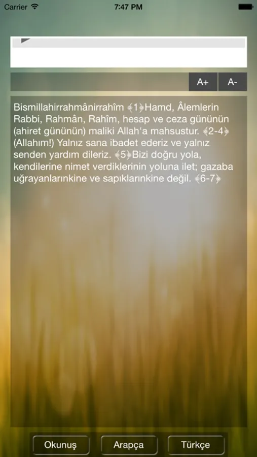 Fatiha Suresi uygulamasında namazın her rekatında okuduğumuz Fatiha Suresinin Türkçe okunuşunu, anlamını, Arapça yazılışını okuyabilir ve Arapçasını sesli olarak dinleyebilirsiniz.