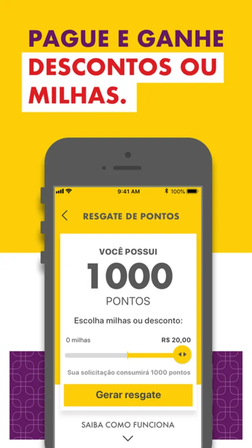 • Pronto! Aproveite pontos que valem descontos no abastecimento de combustível ou milhas (1). E resgate quando quiser, sem taxas ou valor mínimo!