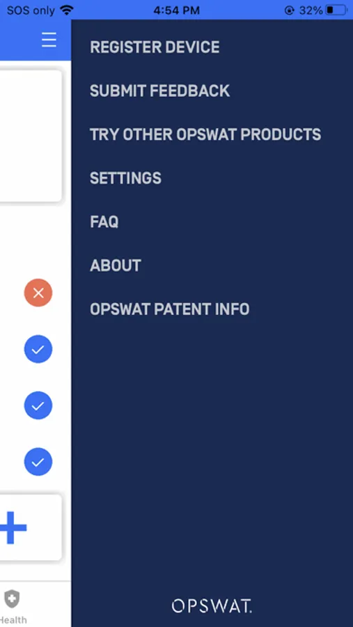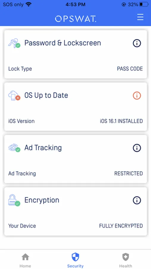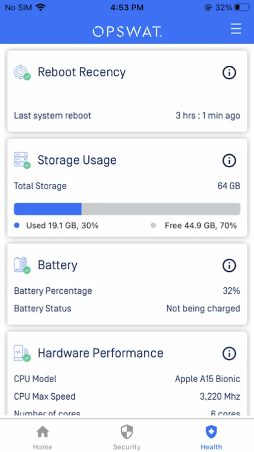 If your device has been slow or unstable, OPSWAT Mobile App also provides a health report with instructions for improving stability issues like insufficient free memory or an out-of-date operating system.