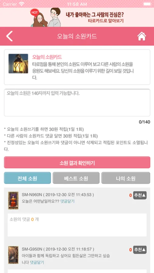 - 타로를 통해 오늘의 소원을 빌어보세요. 소원을 빌어도 무료 포인트가 적립되고 다른 사람 소원을 응원(댓글쓰기)해주셔도 무료 포인트를 적립해 드립니다.