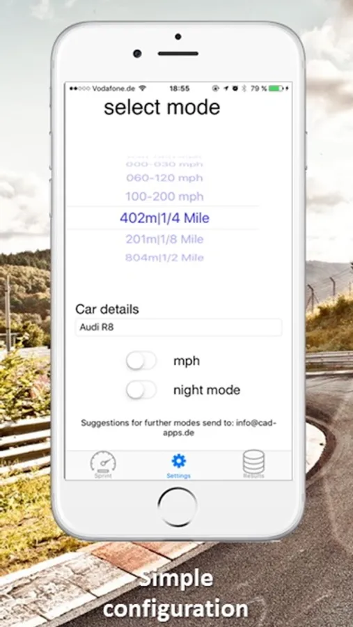 *You can choose between following preset modes: 0-60 mph, 1/4 mile, 1/8 mile, 1/2 mile, 0-35 mph, 60-120 mph, 100-200 mph, 80-120 km/h, 0-250 km/h, etc.