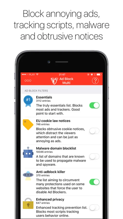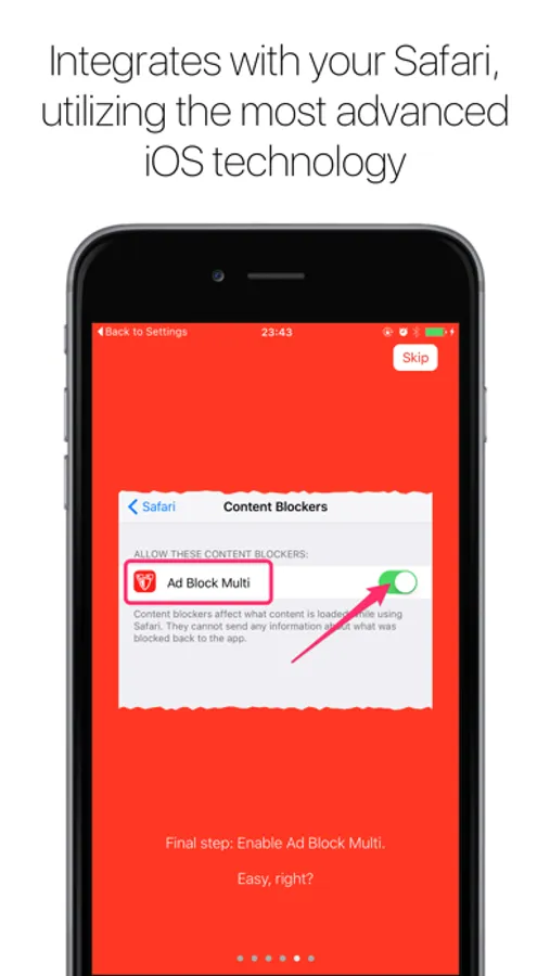 Utilizing the most advanced iOS technology, Ad Block Multi integrates with Safari and applies the combination of filters you select to your further browsing experience.