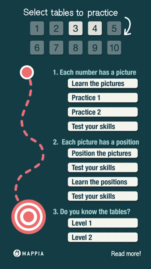 The Mappia method uses pictures instead of numbers to learn the tables. This is helpful for the brain, as pictures are more tangible than numbers (this is also a known memory technique). The method consists of three steps, all fully implemented in the tool MappiaMulti.