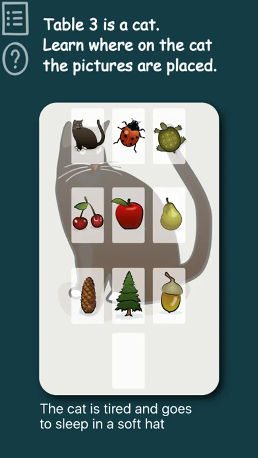 Step 2: The order in the table is learned by associating each picture with a certain position. This step utilises the brain's strengh in remembering places and positions. Using a combination of pictures and positions has been proven to be one of the major organising principles in the brain, e.g. by the 2014 Nobel prize laureate in medicine.