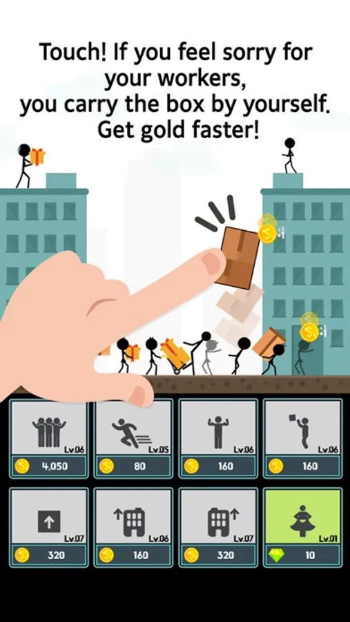 Touch! If you feel sorry for your workers, you carry the box by yourself. Get gold faster!